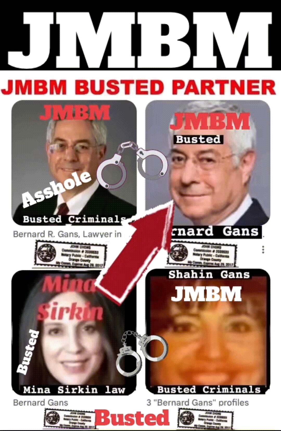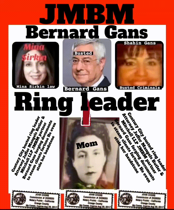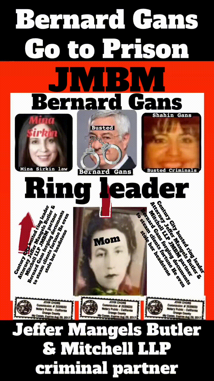 Bernard Reginald Gans # 57068 - jmbm California Business Lawyers Articles | Jeffer Mangels Butler & Mitchel LLP (JMBM) 1900 Avenue of the Stars, 7th Fl Los Angeles, CA 90067 310.203.8080 #58420 Luigi Bernard R. Gans - Articles | Jeffer Mangels Butler & Mitchel LLP California Business Lawyers Jeffer Mangels Butler & Mitchell LLP partner Bernard gans engaging in criminal acts forging illegal documents. GMBM attorney Bernard Gans patent lawyer is a criminal Jeffer Mangels Butler and Mitchell LLP jmbm lawyer Articles | bernard r. gans